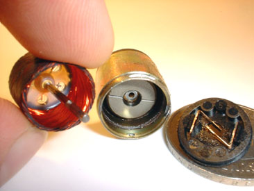 < Im Bild ist ein geöffneter 1717 zu sehen. Der Magnet sitzt im inneren des Motors fest, die ständerlose Drahtglocke dreht sich im Spalt zwischen dem Magneten und dem Rückschlussring (=Gehäuse) des Motors.
