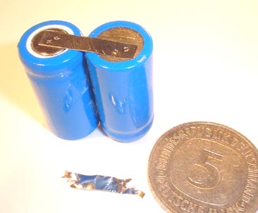 250mAh Zelle von Panasonic mit geschweißten Zellenverbindern Diese Verbinder sind 3,8mm breit und so dünn, dass man sie mit der Mikrometerschraube messen muss. Also bloss weg damit!