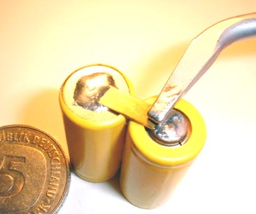 Die zweite Zelle wird in der Hand gehalten. Mit der Hammerlötzpitze werden nun beide Zellpole ca.: 3 Sekunden lang aufgeheizt.