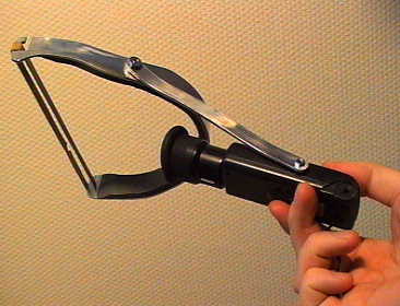 Der Bau des "Visors" gestaltete sich dann auch als rel. einfach - ein 2mm Alubügel wird der Stirnform genau angepaßt und auf der Innenseite mit einem Schaumstoff beklebt. Ein Gummiband hält nun die Apparatur in gewünschter Position. - Das Ganze sitzt wesentlich bequemer als es aussieht. Ein geschirmtes Kabel sorgt für die Stromversorgung sowie für das Videosiganal für den Visor - dieser wird über einen Spannungsregler (6V) aus dem Empfänger (12V) versorgt.