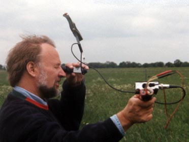 Der Meteor wurde von mir gestartet und auf Höhe gebracht - Patrick genoß mit dem Visor die Startsequenz und den Steigflug. Erst als das Videobild die ersten Störungen aufwies wurde der Motor ausgeschaltet und der Visor übergeben. Da der Meteor rel. eigenstabil fliegt und einen extrem weiten Geschwindigkeitsbereich verkraftet, konnte ich mich (ohne Sorge um das Flugzeug) auf das Videobild konzentrieren. Hierbei stellte sich heraus, daß man die Umgebung unbedingt kennen muß - ansonsten verliert man sofort die Orientierung! Eine weitere gefährliche Verleitung ist der extreme Streckenflug - d.h. man sieht ein interessantes Objekt (Gehöfte, Windkraftanlagen, Siedlungen.....) und schaut es sich gemütlich an - da die Kamera jedoch nach vorne gerichtet ist, fliegt der Segler während dessen auch in diese Richtung - d.h. man kann das Objekt immer schöner sehen und vergißt dabei völlig die erhebliche Strecke die der Meteor in wenigen Sekunden im Gleitflug zurücklegt. Folglich reißt die Funkverbindung früher oder später ab. Jetzt ist guter Rat teuer - wo ist das Objekt in Wirklichkeit - kann ich den Flieger noch sehen - wie ist die Fluglage, Höhe usw. Um diesen Fehler zu vermeiden stand mir Patrick zur Seite und warnte bei zu großer Entfernung des Fliegers rechtzeitig. Selbstverständlich wurde der Meteor auch von Patrick nach dem Videobild gesteuert. Anfangs machten die nicht vorhandenen Ortskenntnisse probleme, später war auch dieses kein Problem mehr. Auffallend war jedoch, daß Patrick das für ihn ungewohnte Modell mit der "Borgbrille" WESENTLICH besser fliegen konnte als auf konventionelle weise. Um so größer war meine Verwunderung als er das Modell durch Zufall in eine Ablösung flog und innerhalb kürzester Zeit an die Sichtgrenze brachte ohne dieses selber zu bemerken - Zitat: Die Aussicht war so schön......