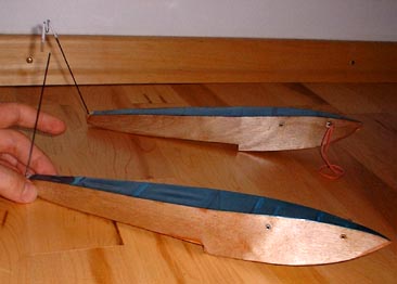 Und das ist schon alles, was ein Slowflyer zum "Schwimmen" braucht. Die gesamte Konstruktion läßt sich einfach anstelle der Räder an die Fahrwerksbeine stecken - die hinteren Streben werden mittels 0,8mm Stahldraht an das Rumpfrohr geklemmt - Um die Schwimmer sicher auf den Fahrwerksbeinen zu halten, wird ein Gummiband zuwischen selbige gespannt - fertig. | ![]() |