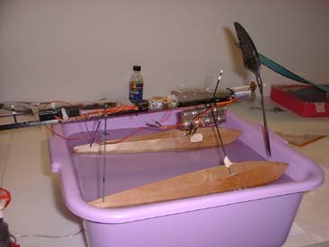 < Zu ersten Schwimm- bzw. Schwerpunkttests reicht bei solchen Modellen eine Schüssel Wasser locker aus - Der Schwerpunkt sollte dabei so weit wie möglich nach hinten verlagert werden, um ein Überschlagen bei schlechten "Landungen" zu vermeiden.... Der Schwimmer entstand aus 0,4mm Flugzeugsperrholz im laufe einen Abends. Die Oberfläche wurde mit Klarlack versiegelt, die Schwimmeroberseite mit Oracover-light geschlossen. |