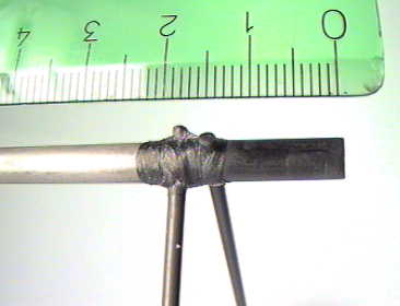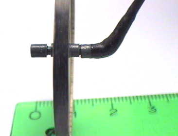 So sollte das andere Ende des Fahrwerkbeines aussehen. Die 2mm Kohlestange wurde mit einer Dreiecksfeile fast durchgefeilt, geknickt, und im passendem Winkel fixiert. Anschließend wird ein ca. 2mm langes Stück eines Bowdenzugröhrchens im Abstand von ca. 3mm zur Knickstelle angebracht. Nun wird die Knickstelle reichlich mit Rovings umwickelt und verklebt. Zur Radseite hin wird das Bowdenzugstück als Anschlag benutzt, zur Fahrwerksbeinseite hin sollte die Umwicklung langsam auslaufen, um einen guten Kraftfluß zu gewährleisten. Die Fahrwerksbeine meines Flyers sind genau 11cm lang und stehen im 65°Winkel zueinander. Ist die Propellerwahl schon im Voraus bekannt, sollte das Fahrwerk so kurz angefertigt werden, daß die Bodenfreiheit der Blattspitze des Props, bei montierten Rädern, nicht mehr als 1cm beträgt. Wer nur in der Halle fliegen will, sollte meiner Meinung nach das Fahrwerk noch knapper dimensionieren, da dieses die Flugeigenschaften erheblich verschlechtert!