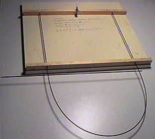 Als nächstes werden die "Tragflächenhälften" erstellt. Sie bestehen aus jeweils einem 1m langem 2mm Cfk Stab, welcher durch biegen seine Form erhält. Um dieses Teil zu erstellen kommt man um eine Bauhalterung nicht herum. - Diese kann (wie im Bild) recht einfach erstellt werden, indem man zwei Leisten im Abstand von 24cm mit 2mm durchbohrt und sie im Abstand von ca. 23cm parallel auf ein Brett nagelt. Ist diese Halterung fertig, wird der 2mm Cfk Stab jeweils 25cm von seinen Enden entfernt markiert und durch die Löcher der Halterung geschoben. Ich brauche wohl nicht zu erwähnen, daß der Cfk Stab enorm unter Spannung steht - Das muß so sein, da die Tragfläche so ihre hohe Stabilität erlangt. (Bei Deformation muß ja erstmal die Eigenspannung überwunden werden) Wurde jedoch versehentlich ein fehlerhafter Cfk Stab verwendet, kann es leicht passieren, daß er beim Biegen (oder in der Form) zerplatzt - Also Schutzbrille tragen !!!!