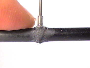 Als nächstes werden die Träflächenpylone aus 1mm Cfk erstellt. Diese Teile sind natürlich extrem wichtig und müssen im Falle eines Zusammenstoßes enorme Biegebeanspruchung aushalten. Daher wird hier ein Bowdenzugsinnenrohr zur Vermeidung der Kerbwirkung (ähnlich wie beim Fahrwerk empfohlen) verwendet. Als erstes sollte der Rumpf an den entsprechenden Stellen mit 1mm komplett durchbohrt werden (7 und 31 cm von der Rumpfspitze aus gesehen). Das obere Loch wird anschließend mit einem 2mm Bohrer aufgebohrt. Jetzt wird ein ca. 5mm langes Stück Bowdenzuginnenrohr auf die 1mm Tragflächenpylon soweit aufgesteckt, daß dieser ca. 2mm auf der anderen Seite herausschaut. Genau auf die herausschauenden "2mm" wird ein Tropfen Sekundenkleber plaziert, so daß der Kleber durch die Kapilarkraft bis zur Mitte des Bowdenzugröhrchens steigt. Der so präparierte Pylon wird nun in die Rumpfbohrung gesteckt. -Oben das Röhrchen im 2mm Loch verkleben, unten die Kohlefaser im 1mm Loch verkleben und selbstverständlich die Schwachstelle im Rumpf mit Rovings verstärken. Es darf auf keinen Fall Sekundenkleber auf das, auf dem Foto sichtbare, obere Ende des Bowdenzuginnenrohres gegeben werden, da der Cfk Stab ansonsten stark verspröden und bei Biegung hier brechen würde!