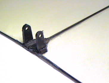 Stabilitätsmäßig wird diese Verbindung nicht vor den Cfk Stäben versagen!Sind beide Tragflächenhälften auf diese Weise erstellt, kann man sie mit dem Mittelstück verkleben.- Den aufmerksamen Lesern wird aufgefallen sein, daß der Abstand von der Nasen- zur Endfaser 24cm beträgt, der Abstand der Messinghülsen im Mittelstück aber nur 23,4cm beträgt! - Das ist richtig so, da ja die Kompressionsrippen noch gespannt werden müssen - dann paßt alles genau.