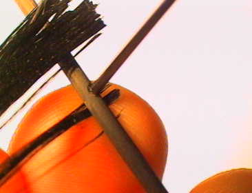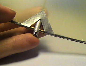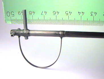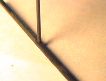 Genau so sollte die K.rippe auf den (natürlich noch in der Halterung steckenden) 2mm "Nasen-" sowie "End-Stab" stoßen. In diesem Baustadium sollte der Stab mit einem Hauch Sekundenkleber fixiert werden, damit er bei weiterer Bearbeitung nicht verwackelt.