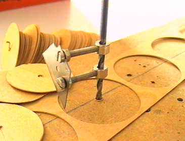 Es ist ratsam sich zum Erstellen der Räder ein kleines Hilfswerkzeug zu basteln. - Mit diesem Kreisschneider lassen sich in Sekundenschnelle eine Vielzahl von Rädern schneiden. Er besteht aus einer abgebrochenen Teppichmesserklinge 3mm Schrauben und zwei Stellringen....... bei 1000upm in einer Ständerbohrmaschine kann die Produktion dann losgehen. Nacharbeiten ist nicht erforderlich zumal das 3mm Loch für die Nabe schon mittig sitzt. Das Rad selbst besteht aus 0,2mm Flugzeusperrholz und sollte für den "Next Gen." einen Durchmesser von ca.: 4cm haben.