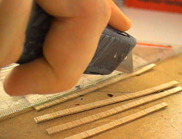 Sind die Radscheiben fertig, werden die Laufflächen aus 1mm Balsa geschnitten. Sie sollten eine vorläufige Breite von ca.: 3-4mm haben. Wichtig ist, daß die Faser quer verläuft - ein späteres Biegen währe sonst unmöglich! Ich schneide das sehr dünne Balsa mit einem Teppichmesser. -Natürlich nicht in einem Durchgang - zwei bis drei mal die scharfe Klinge an einem Lineal entlang führen - schon hat man hervorragende Leisten. So ganz 100% brauchen die nicht zu sein aber dazu später mehr.