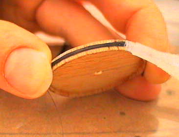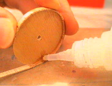 Naja - die Kamera, das Rad, den Kleber in der Hand und dabei digitalisieren ist alleine nicht ganz einfach. Aber schematisch werden so die "Radreifen" aufgezogen. Einen Tropfen Sekundenkleber auf den Balsastreifen und dann das Sperrholzrad mit ordentlichem Druck überrollen. - Sofort klebt die Lauffläche am Rad - etwas hin und her gerollt und weiter geht's - nächsten Tropfen und weiterrollen. Das geht hervorragend! Wichtig ist nur, daß man auf das Baubrett ein Stück Folie leg - sonst backt jeder mit jedem!