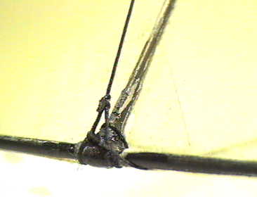 Im Bild links ist die Situation mal wieder nachgestellt. - Es soll die prinzipielle Führung des Kompressionsfadens gezeigt werden. Zwischen den Fingern halte ich den 2mm Tragflächenstab - der dünne Stab ist die noch nicht gespannte K-Rippe. Der K-Faden wird natürlich erst nach dem Bespannen eingefädelt und einfach mit einer Nadel durch die Bespannung gepikst. (Auch wenn es weh tut - das muß sein)