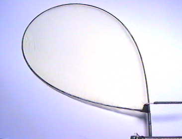 So sieht das dann bei der fertigen Fläche aus (von unten gesehen).> Der Faden sollte so stark gespannt werden, daß sich eine Wölbung von 2 - 3 cm einstellt. Ich brauche wohl nicht darauf hinzuweisen, daß die Wölbungen der beiden K-Rippen absolut identisch sein müssen, oder? Bei genauer Betrachtung ist sogar der Faden der V-Form-Verspannung sichtbar.
