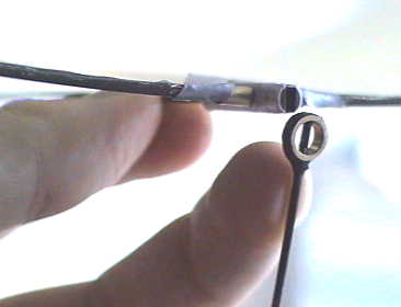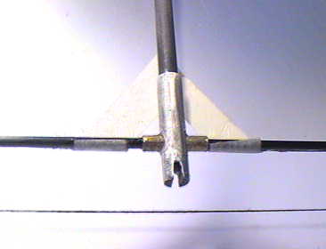 Fangen wir mit dem Seitenleitwerk an. Es besteht aus einer 50cm langen, gebogenen 1mm Faser. Wichtig ist hierbei, das die Faser nicht mit den Enden verklebt wird, sondern mind. 5cm zur Lagerung hin frei steht. Auf das freistehende Ende wird dann ein Bowdenzuginnenrohr aufgeschoben und verklebt. (Siehe Kapitel "Klebestellen") Als oberer und unterer Anschlag gegen herausrutschen dienen dann die Außenrohre. Es ist ratsam die Klebestelle nicht rechtwinkelig, sondern im ca. 80° Winkel auszuführen, um so einen größeren Höhenruderausschlag zu ermöglichen. Das im Bild gut sichtbare Ruderhorn kann aus einem Servokreuz oder einem Kohlelaminat erstellt werden.