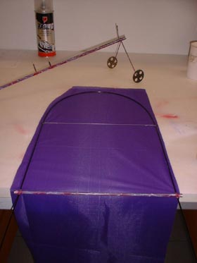 Letztendlich wird die Fläche verspannt und gerichtet. Das Foto zeigt die Fläche unmittelbar vor dem Straffen des Nylons. Gestrafft wird hier NICHT mit Heißluft, sondern mit dem guten alten Oracover-Bügeleisen. Auf Stufe 3 ist das Straffen eine Lachnummer - Die oberste Grundregel gilt aber dennoch: NICHT DIE KOHLEFASER ERWÄRMEN. Das höchste der Gefühle ist ein ganz kurzes Anticken mit dem Bügeleisen .... eine vollkommen faltenfreie Fläche ist dennoch ohne Probleme möglich. |