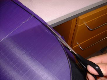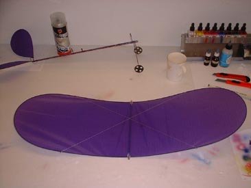 Es ist darauf zu achten, das die dreieckigen Ausschnitte für die Mittelstrebe der Tragfläche vor dem aufkleben eingeschnitten werden. Jetzt wird die 2mm Faser der Tragfläche leicht auf den Tisch gedrückt und das Nylon Stück für Stück mit Sekundenkleber angeklebt. Im Gegensatz zu anderen Folien sollte man hier nicht mit Kleber geizen - eine Kanüle an der Sekundenkleberflasche erübrigt sich somit. Aber Achtung - die Bespannung klebt sofort! - und das für immer! |