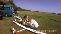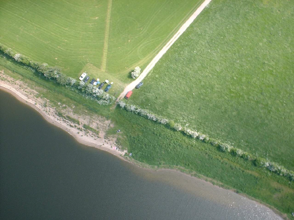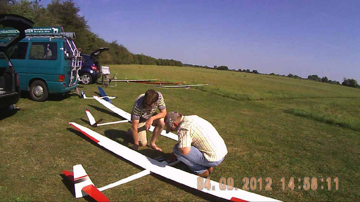 Wir haben dort eine große Wiese gepachtet, in deren Mitte wir das Gras für Start und Landungen für Modelle mir Rädern kurz halten. Der gesamte Platz ist jedoch so groß, dass hindernisfreie Anflüge mit Landungen aus allen Richtungen möglich sind. Das erleichtert vor allen Dingen das Landen bei stärkerem Wind ungemein und ist insbesondere für unerfahrenere Piloten sehr hilfreich.